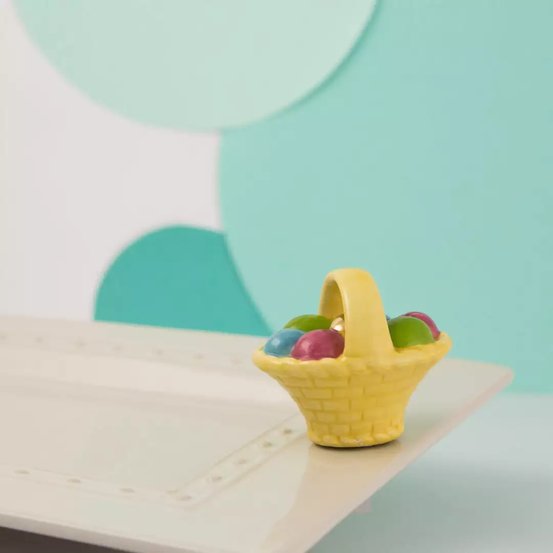 Mini yellow basket filled with pastel colored Easter eggs. Nora Fleming minis can be inserted into Nora Fleming bases and switched out to match any occasion or event you might be hosting!
