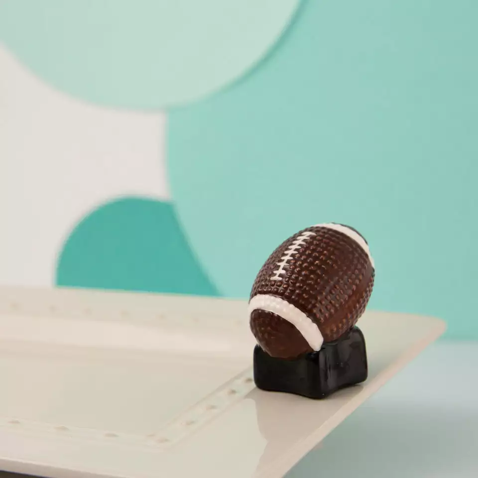 Mini brown and white football on black base. Nora Fleming minis can be inserted into Nora Fleming bases and switched out to match any occasion or event you might be hosting!